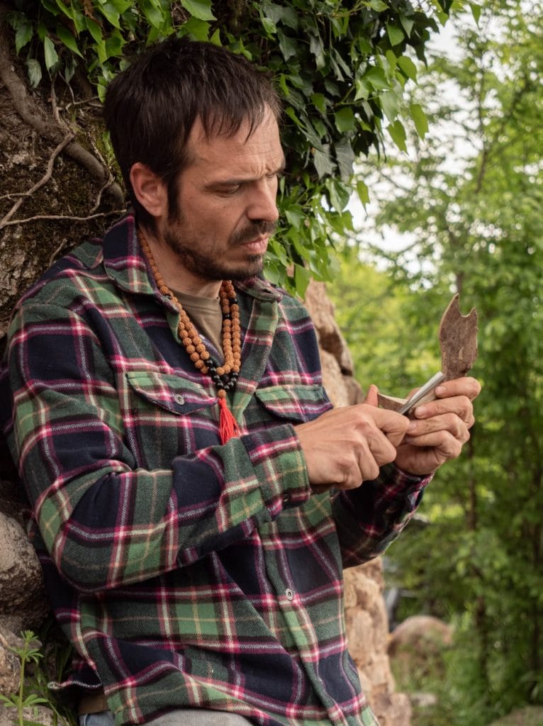 Desde el corazón de los Pirineos, en la Vall Fosca (valle oscuro), en la Escuela de Oficios de Montaña, elaboramos nuestros kuripes y tepis de madera. Le damos todo el protagonismo a la madera; a su orígen (no utilizamos maderas tropicales ni importadas, solo utilizamos especies autoctonas; boj, nogal, roble, encina, madorño, fresno, haya, pino…), a su aprovechamiento (local, mediante gestion sostenible, silvicultura regenerativa y como resultado de la mejora forestal y prevencion de incendios), a sus cualidades (resaltando su grano, aguas, formas, nudos, colores y brillos naturales sín utilizar productos químicos ni barnices plasticos), a su elaboracion (trabajo manual sin complejos donde la marca de la herramienta se encuentra con el carácter y forma natural de la madera), a su funcionalidad (con un canal circular que permite un aliento libre y preciso con una forma organica a la vez que funcional), a su acabado (buscando el brillo natural de la madera a través del pulido y bruñido, cerrando el poro por fregamiento, y subiendo el color con cera de abeja directa del panal, y para los kuripes pintados a mano por Sara, una artista shivaita, utilizamos tintes naturales a base de plantas y decocciones de color, pirogravados y esmalte de goma laca natural para fijar la decoracion), todo esto para destacar su carácter e intención para un uso ceremonial y medicinal de nuestros kuripes y tepis que conecte de madera directa y límpia la medicina del rapé, al individuo y su instrumento de aplicación con el creador, que es lo mismo.